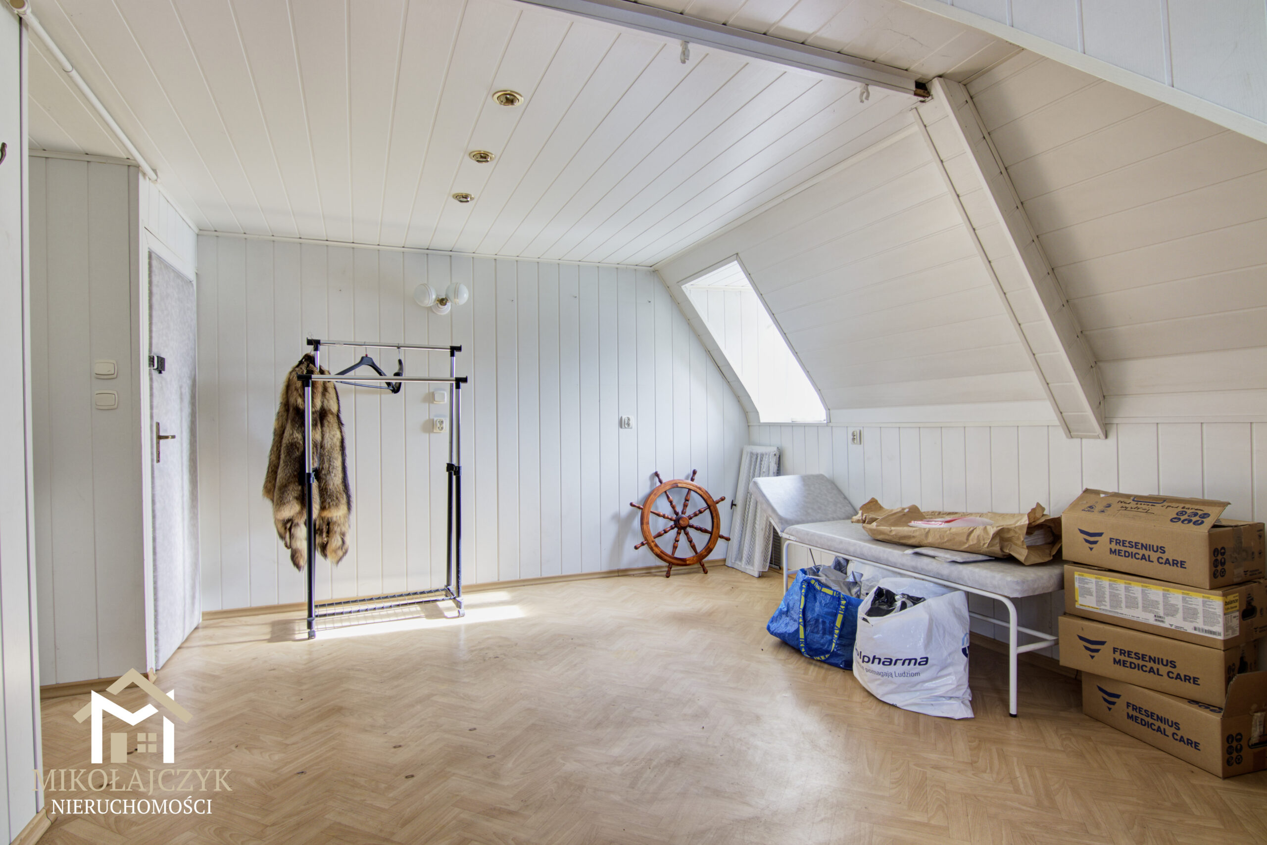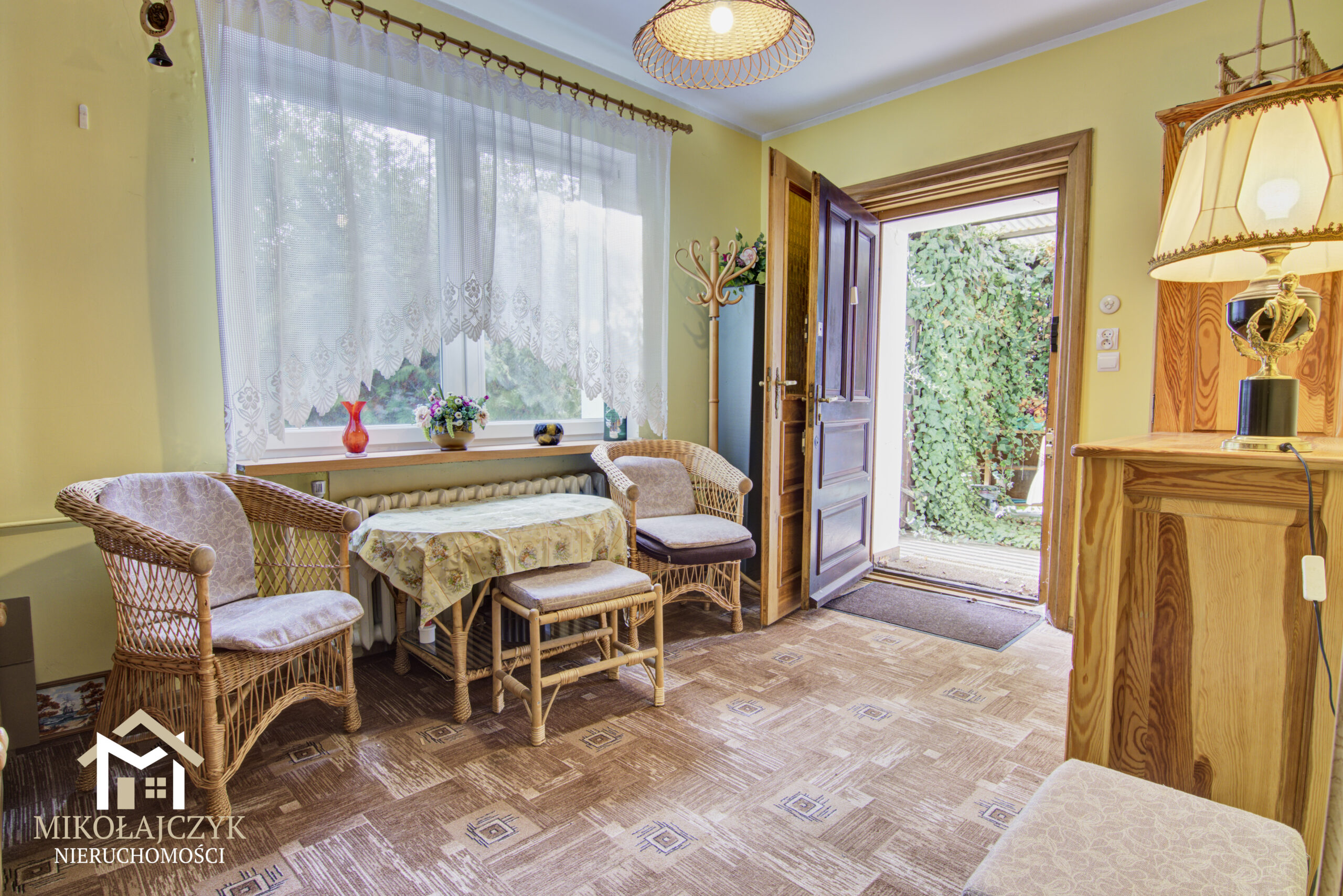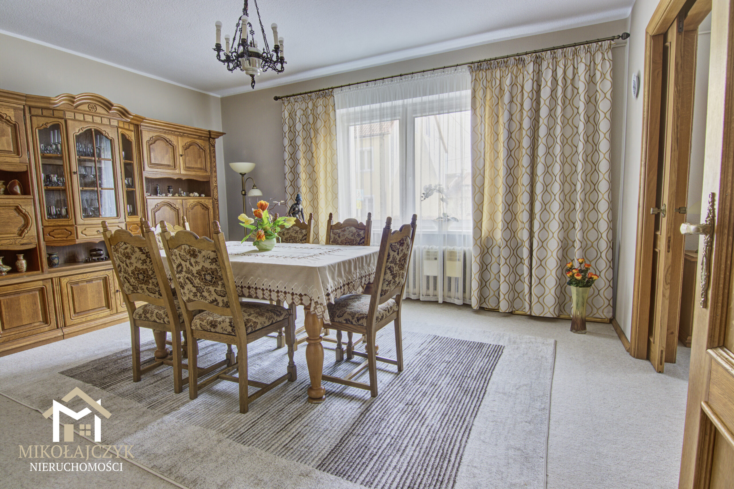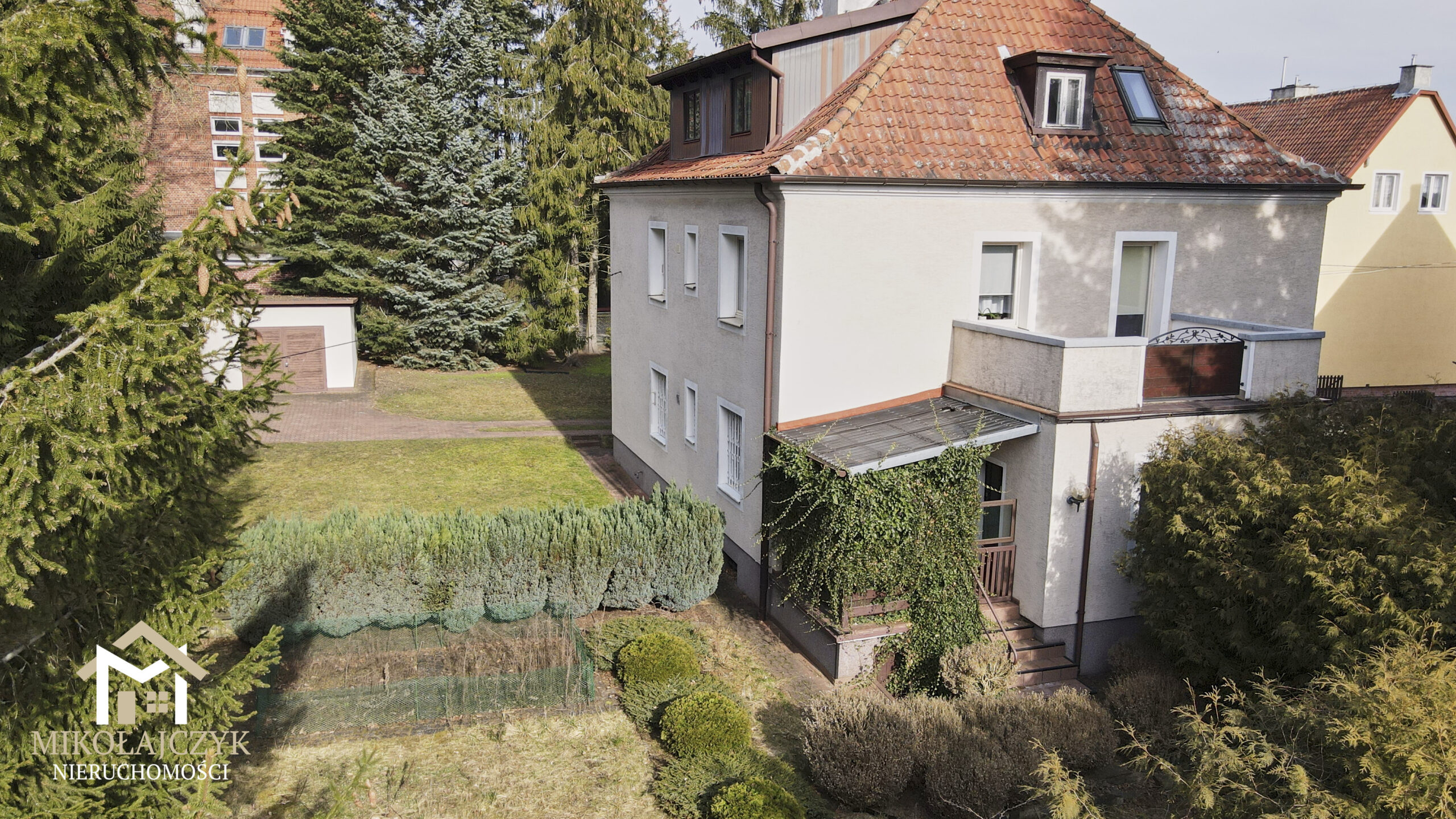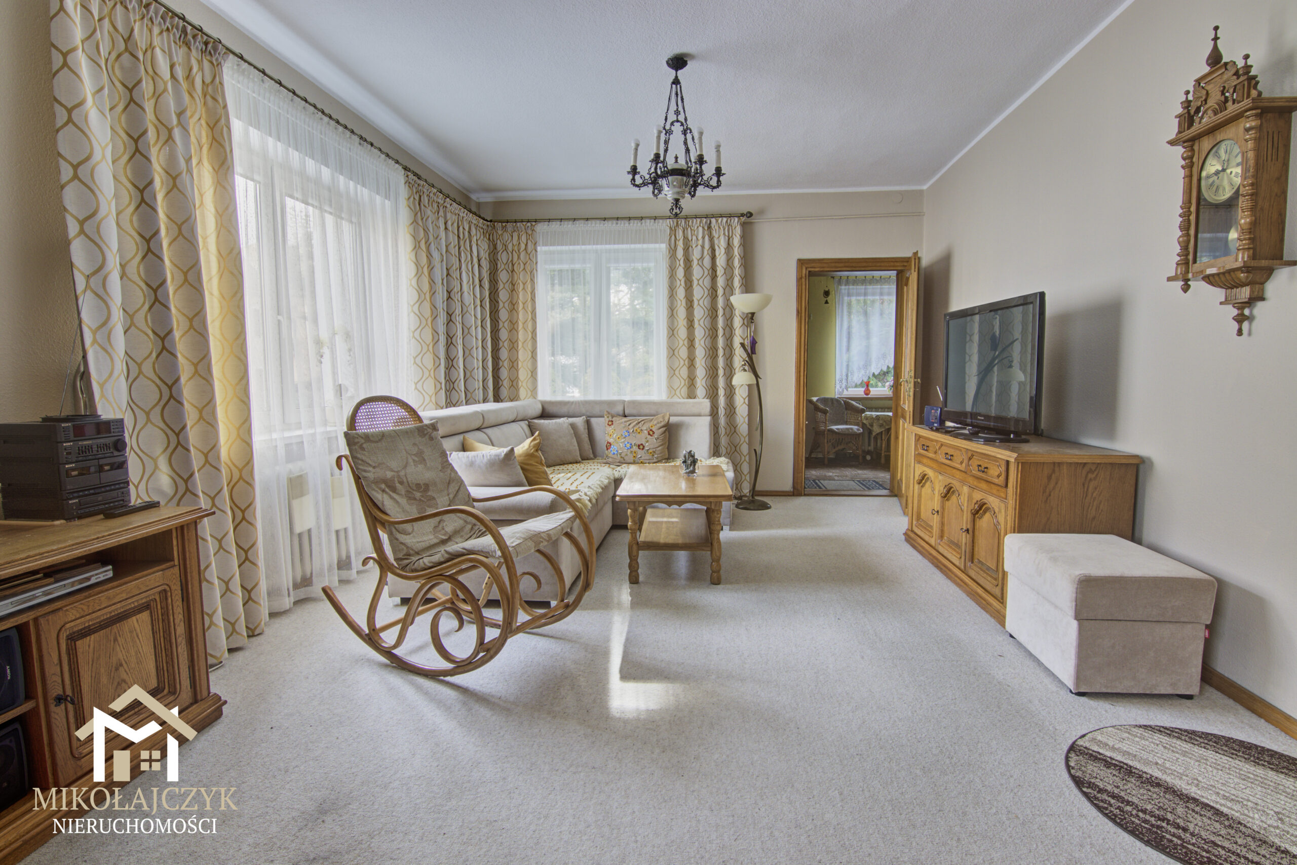 Mieszkanie położone na parterze w domu dwurodzinnym. Budynek został wybudowany w latach 30 i jest w dobrym stanie technicznym. Powierzchnia użytkowa mieszkania wynosi ok. 90,6 m2, na którą składają się 4 pokoje, kuchnia, łazienka z wc oraz przedpokój. Z jednego z pokoi jest wyście na ganek z tyłu budynku skąd można zejść do ogródka. Dodatkowo na drugim piętrze budynku znajdują się dwa pokoje oraz wc o powierzchni ok. 26,2 m2. Łączna powierzchnia wszystkich pomieszczeń wynosi ok. 116,8 m2.