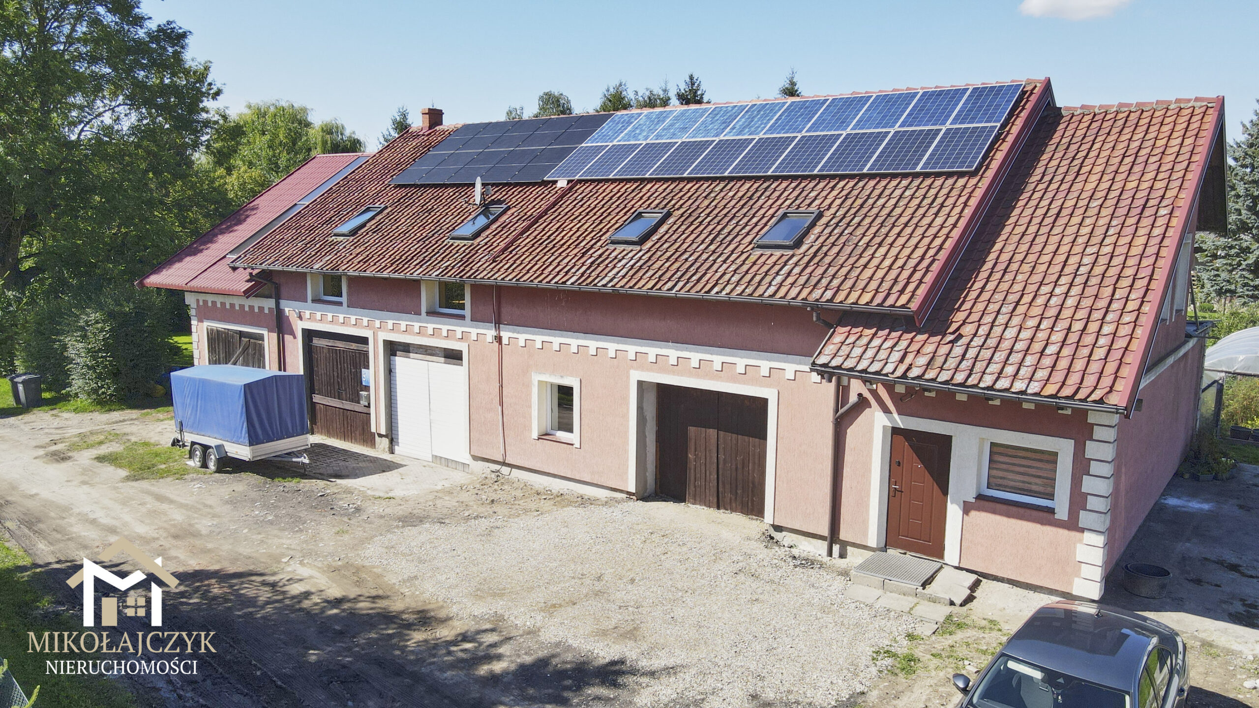 Za ogrzewanie i podgrzanie wody odpowiada klasyczny piec na paliwo stałe, który rozprowadza ciepło poprzez ogrzewanie podłogowe oraz grzejniki. Na dachu zamontowano instalację fotowoltaiczną o mocy 9,9 kW. Dzięki rozliczaniu energii na starych zasadach, rachunki za prąd są minimalne. Dodatkowo w salonie umiejscowiony jest kominek, który ociepli najchłodniejsze zimowe wieczory. Nieruchomość podłączona jest do wodociągu, a ścieki odprowadzane są do przydomowego szamba.