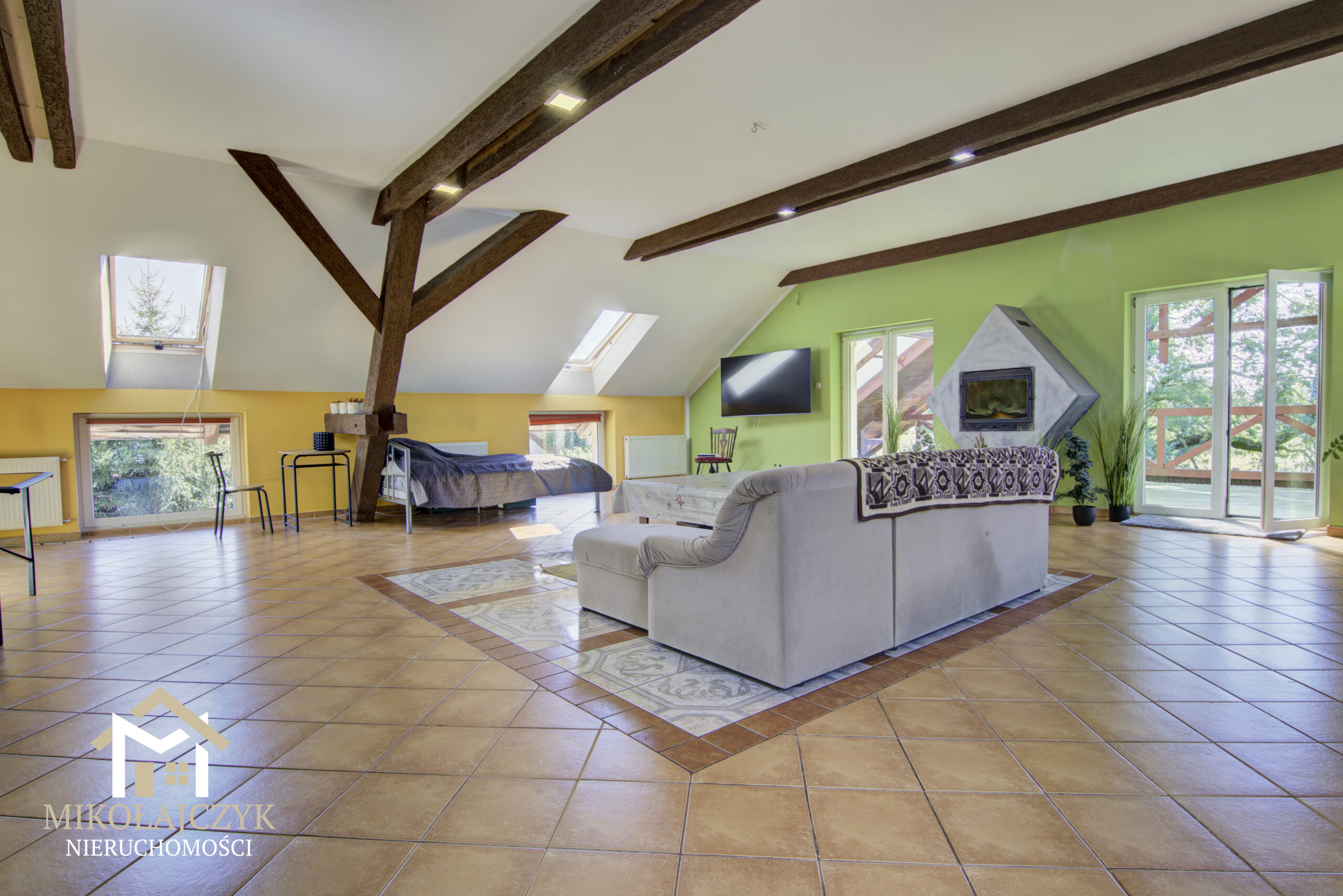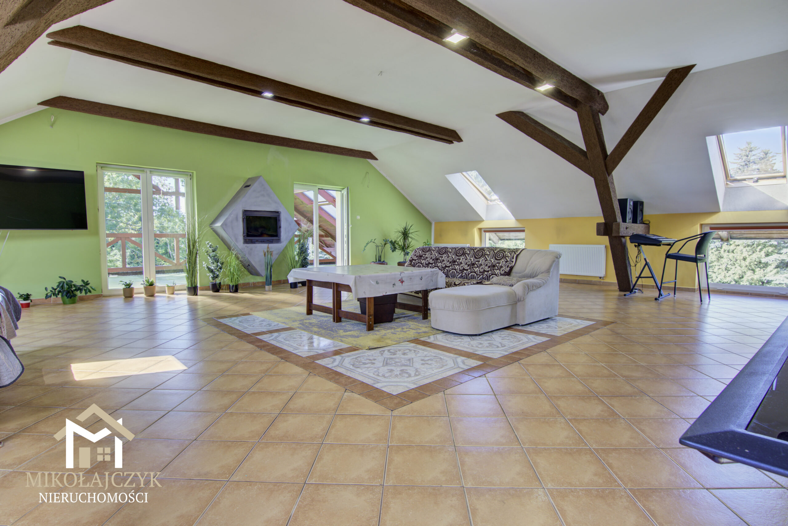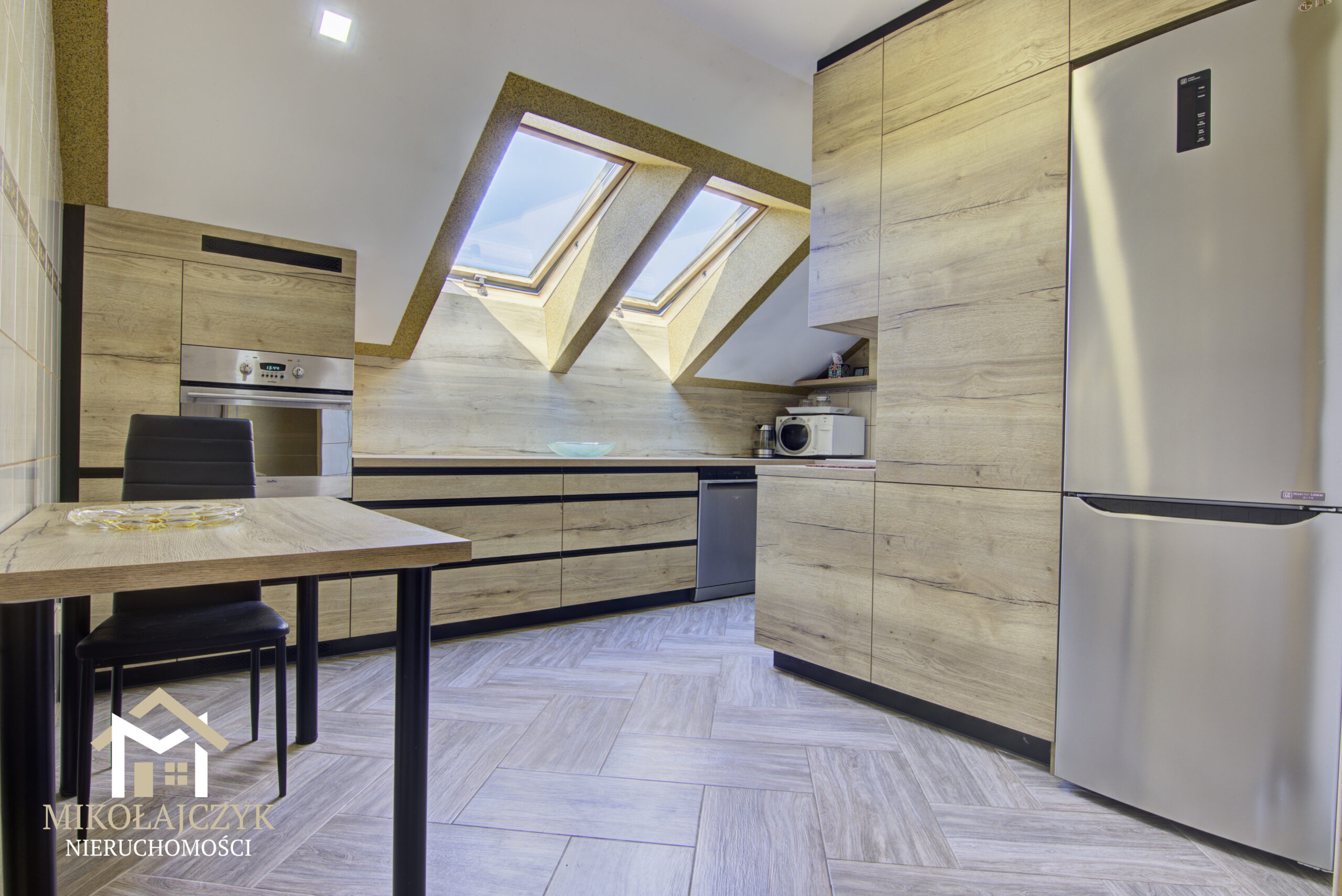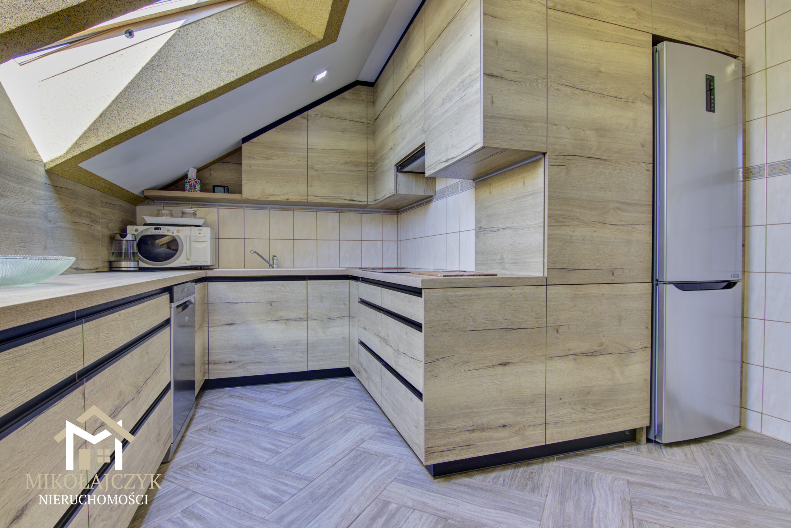 Piętro mieszkalne znajduje się w dobrym stanie technicznym, dzięki czemu nowi właściciele mogą wprowadzić się od razu po zakupie. Kuchnia niedawno przeszła kompleksowy remont, w ramach którego wykonano zabudowę meblową na wymiar. Atutem nieruchomości jest przestronny, zadaszony taras z bezpośrednim wyjściem z salonu, stanowiący przytulne miejsce do spędzania letnich popołudni w gronie bliskich.