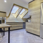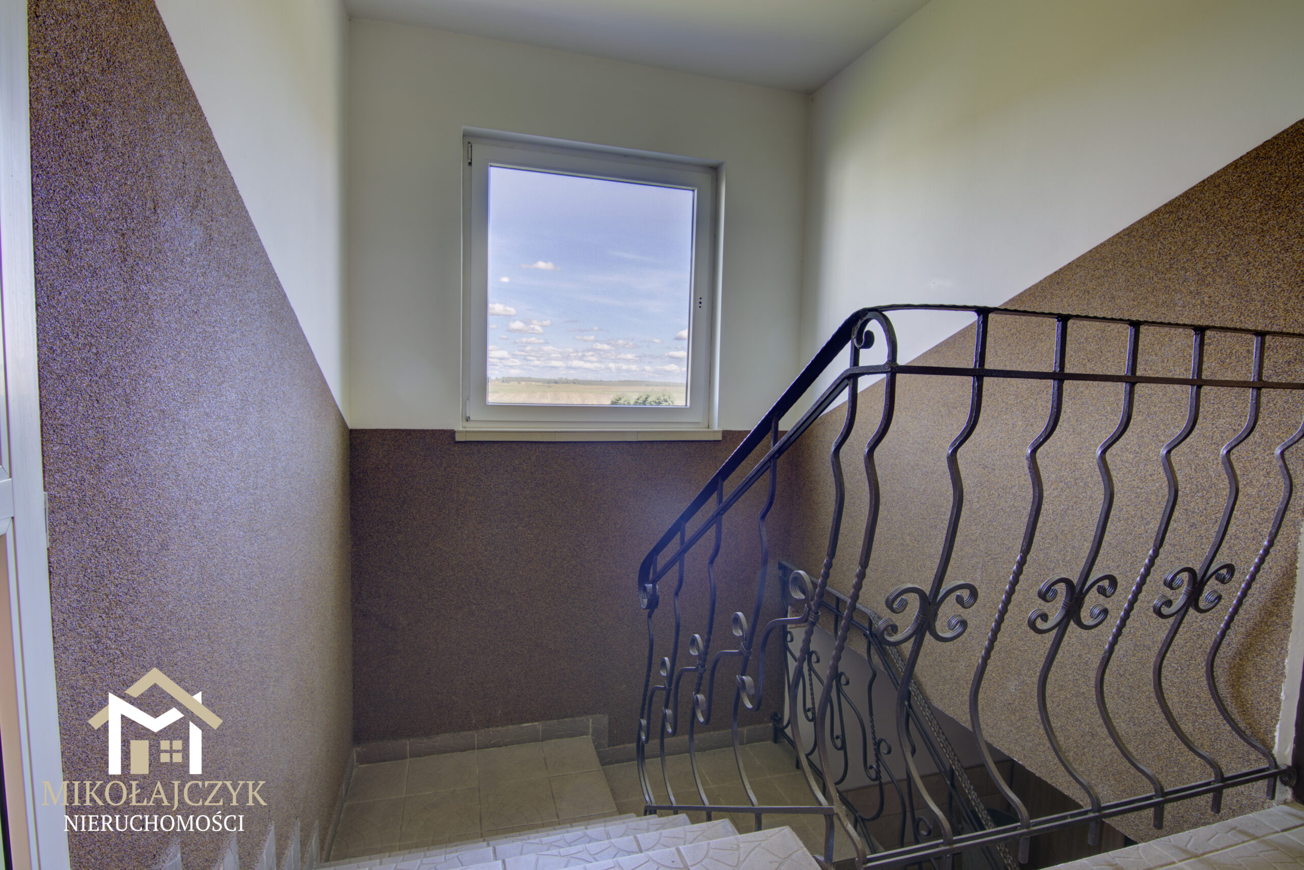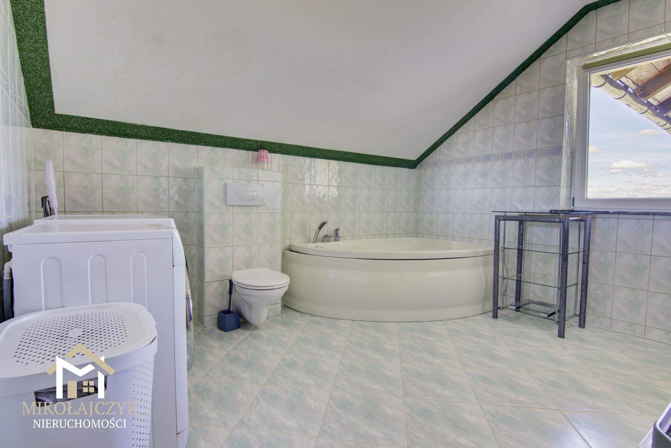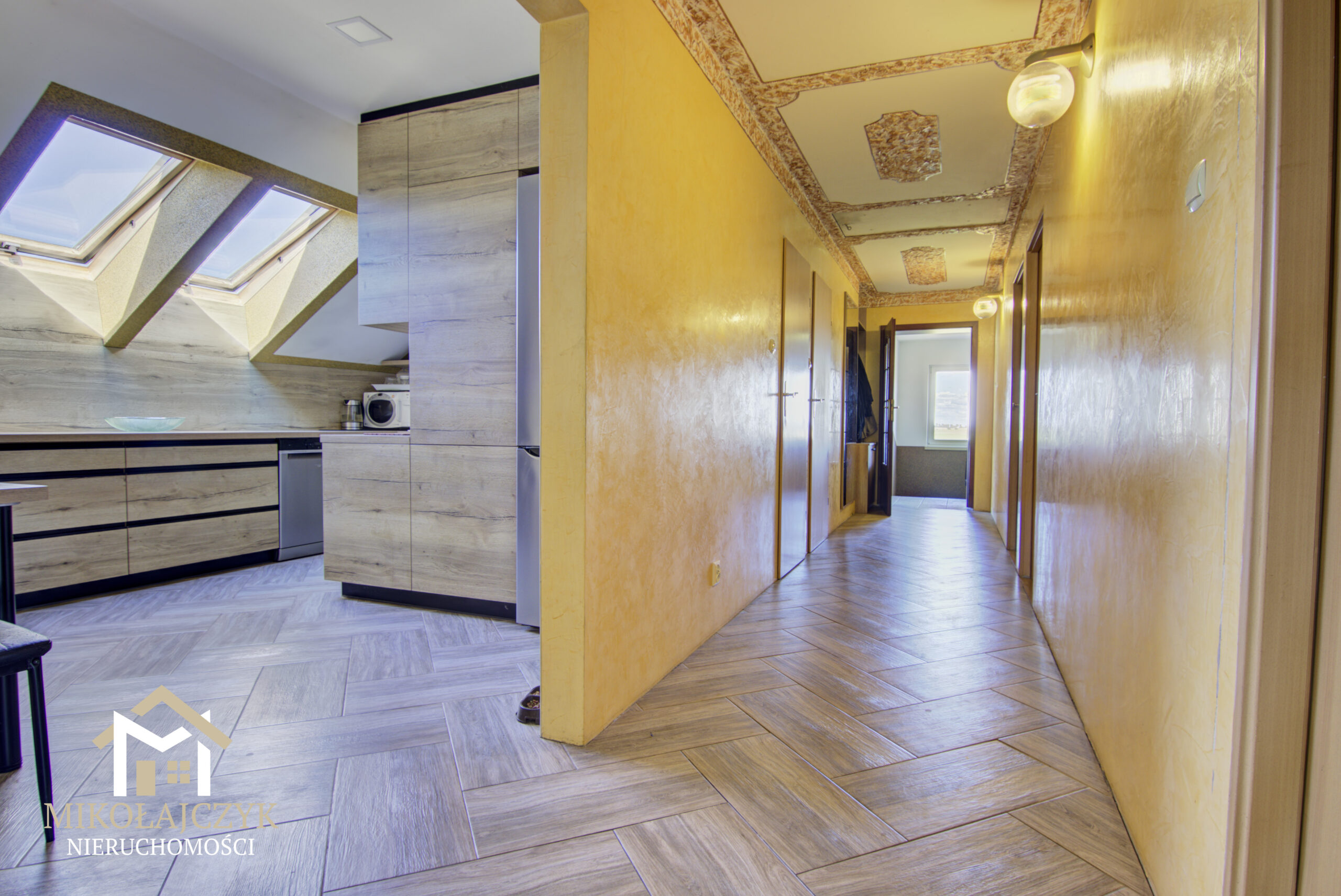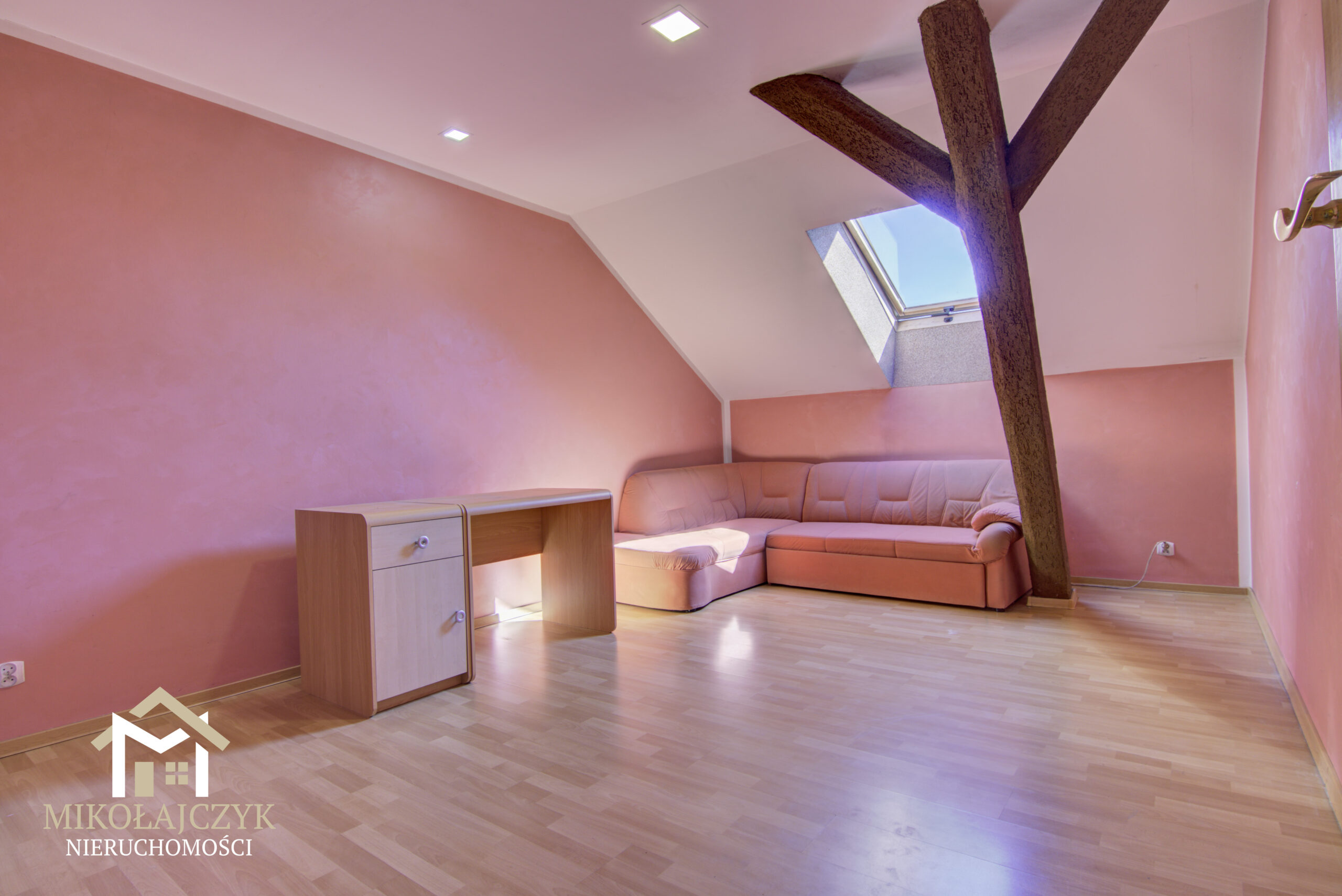 Piętro mieszkalne znajduje się w dobrym stanie technicznym, dzięki czemu nowi właściciele mogą wprowadzić się od razu po zakupie. Kuchnia niedawno przeszła kompleksowy remont, w ramach którego wykonano zabudowę meblową na wymiar. Atutem nieruchomości jest przestronny, zadaszony taras z bezpośrednim wyjściem z salonu, stanowiący przytulne miejsce do spędzania letnich popołudni w gronie bliskich.